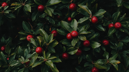 This image showcases lush green leaves adorned with bright red berries, emphasizing the beauty of nature. Perfect for enhancing designs related to gardening or organic themes.