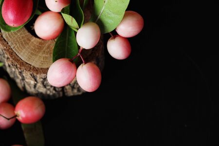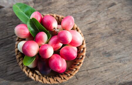 Carunda or Karonda fruit and green leaf in a basket.Tropical Fruits from Thailand and Southeast Asia. The fruit of Karonda is local herbs,