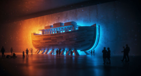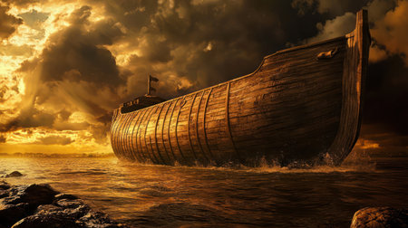 Scene of Noah's Ark anchored in a calm sea. The ark is decorated with wooden planks and ropes, indicating signs of a long journey.