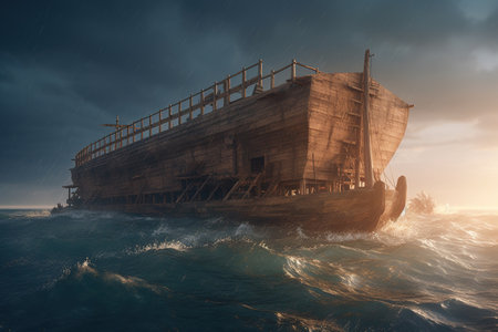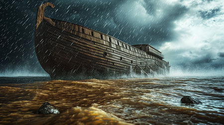 A dramatic, photorealistic image of Noah's Ark floating on the turbulent, stormy water amidst pouring rain and dark clouds during the Great Flood, symbolizing divine judgment, salvation, and the biblical narrative of faith and survival. This image is perfect for religious education, biblical studies, and conceptual art on faith.