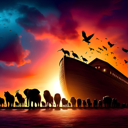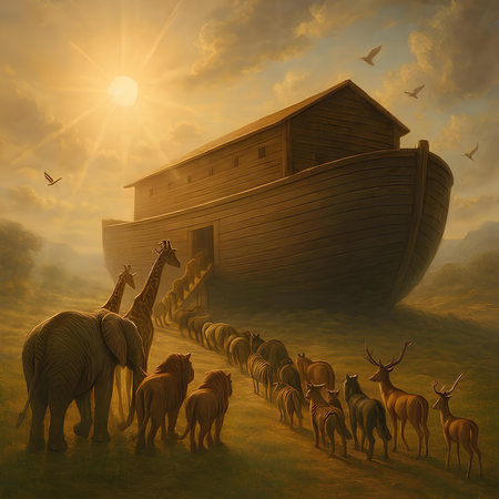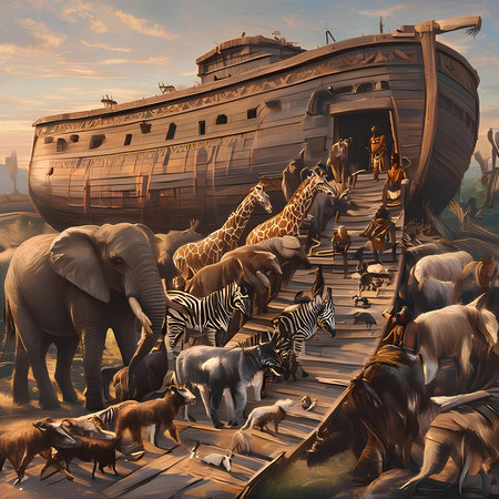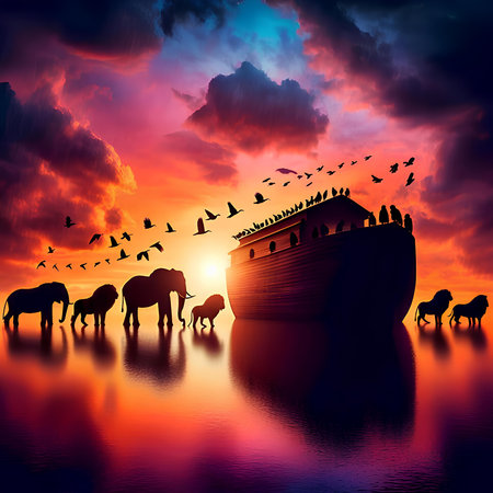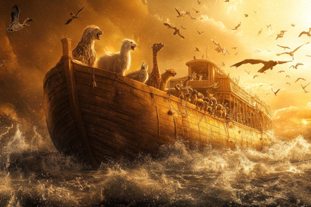 A dramatic illustration of Noah's Ark sailing through turbulent waters with animals visible on deck, surrounded by flying birds in a golden sky.