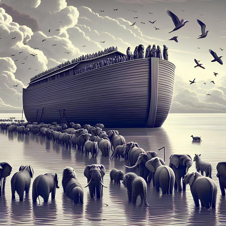 Noah's Ark, animals in the storm, bad weather, rain, sea, boat flood mountain, biblical history. bird dove religion story spirituality holy. old man with a beard