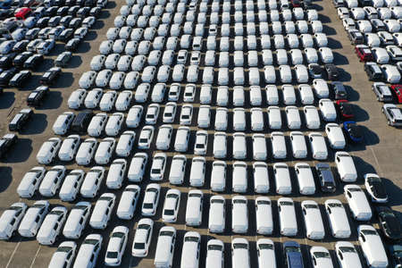 Aerial view of new cars stock at factory parking lot. Above view cars parked in a row. Automotive industry. Logistics business. Import or export new cars at warehouse. Big parking lot at port terminal