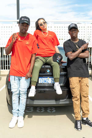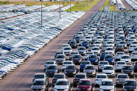 Car factory parking lot with brand new cars ready for export sale. Development of automotive industry in USA concept