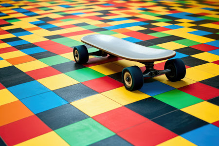 a longboard on a multicolored checkerboard floor, created with generative ai