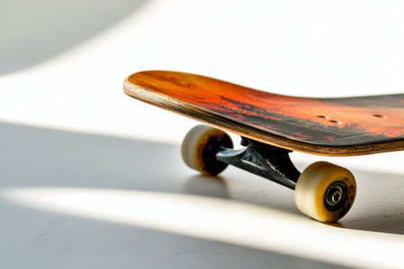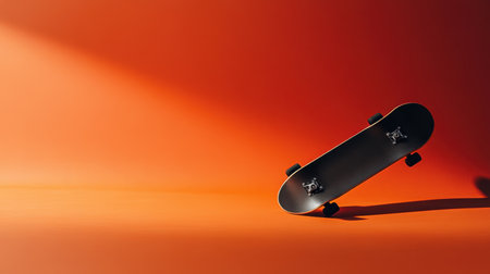 A skateboard rests against a bright orange background, showcasing dynamic shadows and lighting that create a vibrant atmosphere. Ideal for sports and lifestyle themes.