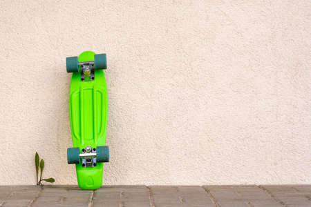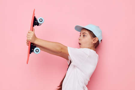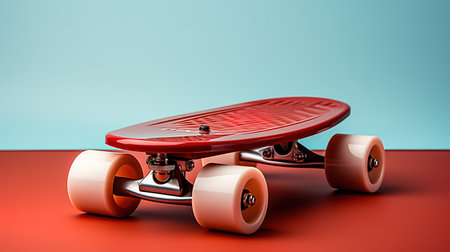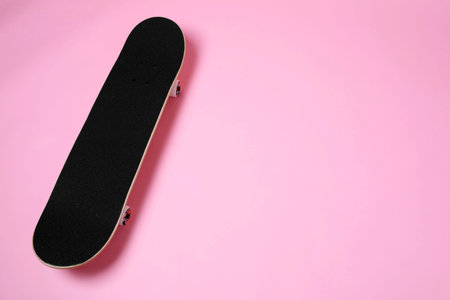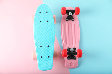 Trendy hipster skateboard on pink blue pastel background. Minimalism concept. Youth lifestyle.
