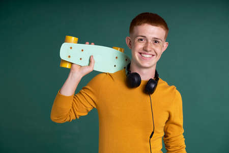 Portrait of young fashionable hipster man posing over crimson wall background splashed by neon lights. Caucasian male holding skateboard and smiling