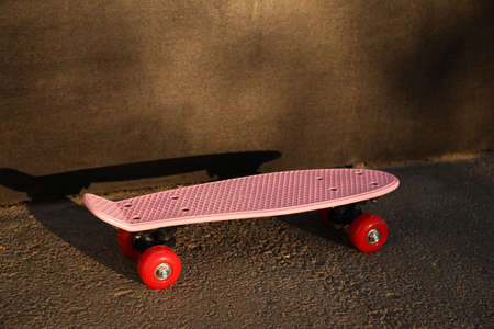 Modern light blue skateboard with pink wheels on asphalt road outdoors