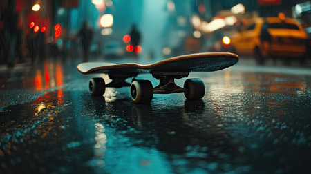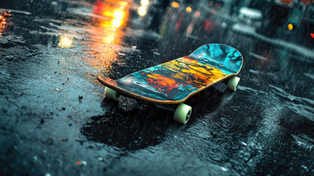A colorful skateboard rests on the wet pavement, surrounded by a rainy urban atmosphere. The vibrant colors and reflections evoke a sense of youthful energy and artistic flair.
