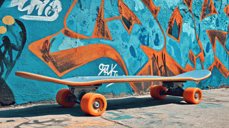 A stylish skateboard rests against a vibrant mural, showcasing a lively urban setting. The colorful wheels and graffiti backdrop capture the essence of youth culture and creativity.