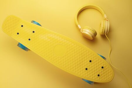Yellow headphones and skateboard or pennyboard on yellow background. Music concept.