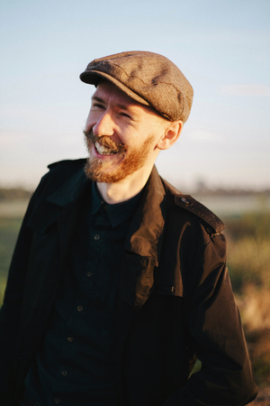 Portrait of a handsome bearded man with blue eyes looking at the camera