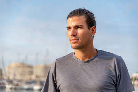 Portrait of a young male model wearing elegant shirt posing dreamily at street looking away.