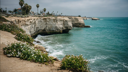 Scenic view overlooking a rugged coastline featuring tall, light-colored sedimentary cliffs being met by vibrant turquoise ocean waves with white foam churning at the base. The foreground shows a dirt path bordering the cliff edge, adorned with low-lying bushes bearing clusters of small white flowers, with palm trees and some distant residential structures visible atop the plateau under a muted, overcast sky.