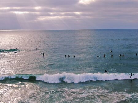 Aerial view of surfers waiting, paddling and enjoying waves before sunset time. Del Mar Beach, California, USA