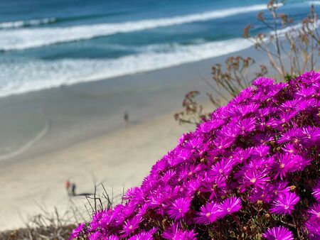 A view of Solana Beach from the top of the cliff with purple flower , California, USA