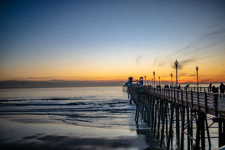Sunset over the beach from the pier in Huntington Beach, Orange County, California