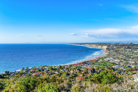 Aerial view of wealthy Encinitas town with blue ocean in San Diego, South California, USA.