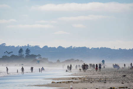Dog Beach off-leash on Del Mar North Beach, people walking their dogs. San Diego County, California, USA. January 07, 2020