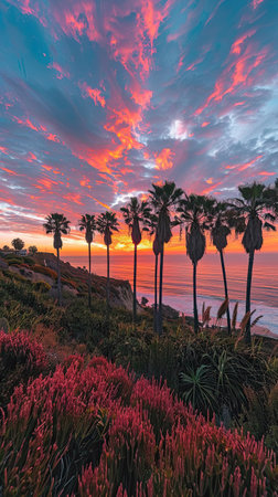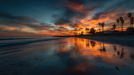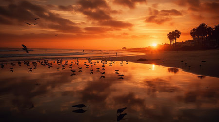 A vibrant red and orange sunset reflects off of a calm ocean shore Palm trees line the golden sand casting long shadows against the warm hazy sky Seagulls glide in the distance while waves gently lap at the shore The serene scene exudes relaxation and tranquility created with Generative AI