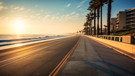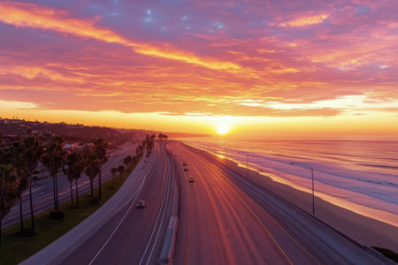 Sunlight casts a warm glow over the ocean as the sun sets on the horizon, illuminating palm trees along a coastal highway. Vehicles travel smoothly under a colorful sky at dusk.