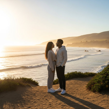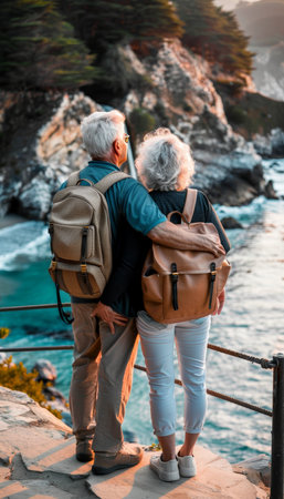 Senior couple enjoying breathtaking views of the pacific coast while embarking on a leisurely hike