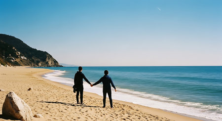 A romantic couple walking hand in hand on a beautiful sandy beach