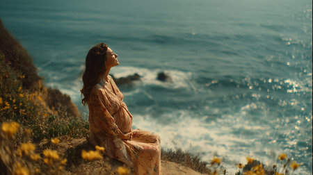 Silhouette standing on cliff, admiring serene seascape generated by artificial intelligence