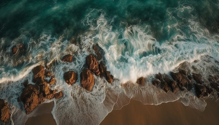 Tranquil seascape crashing waves on rocky coastline, natural beauty generated by artificial intelligence