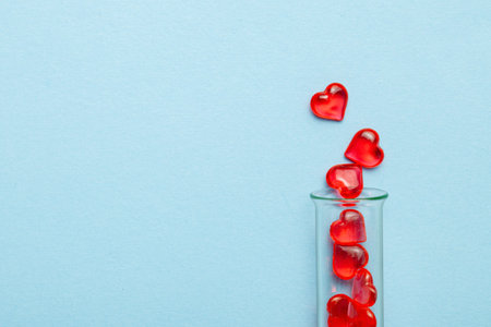 Hearts and test tube. Baby from tube vitro glass. Artificial insemination, IVF. Blue background. Copy space for text.