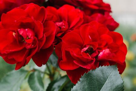 Beautiful red mini roses grow in the garden in summer. Selective focus.