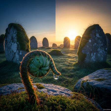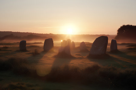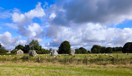 Explore an enchanting scene of ancient standing stones, set in a lush green landscape under a dramatic sky. This image captures nature's beauty and history.
