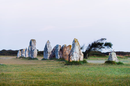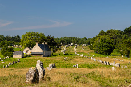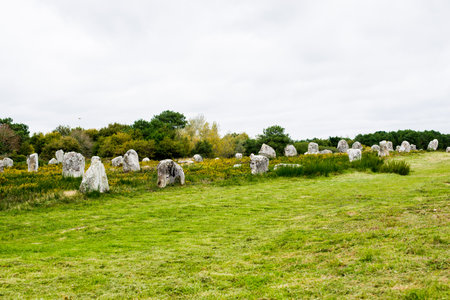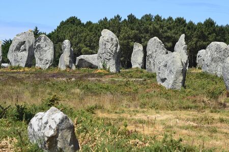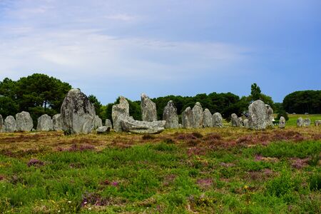 Megalithic stone alignments and single standing menhirs in Carnac, Kerlescan, and Kermario in Brittany, France on a sunny summer day