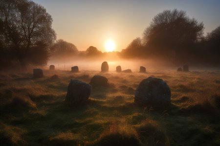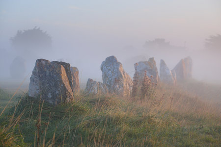Menhir alignment view at Camaret sur mer at sunrise during fog
