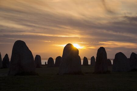 View of the beautiful Baltic Sea coast in southern Sweden during sunset. You can also see the silhouette of a row of stones from the Viking Age of Scandinavia.