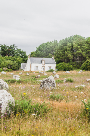 Menhir and typical House in the Carnac Alignments, Brittany Region. France