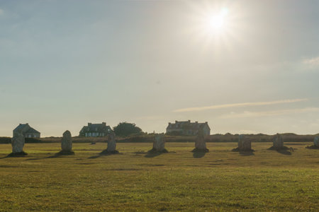Alignment of menhir stones during golden hour on green meadow to sun on the sky, Camaret-sur-Mer, Brittany, France