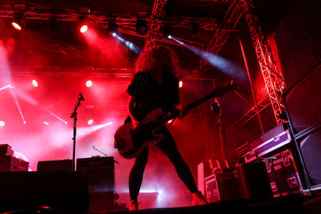 KYIV, UKRAINE - AUGUST 25, 2020: Angry woman with electric guitar looking at camera near guitarist with backlit and blurred drummer on background