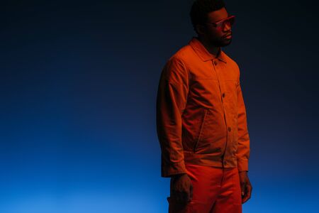 african american man in futuristic look and sunglasses posing on blue in red light