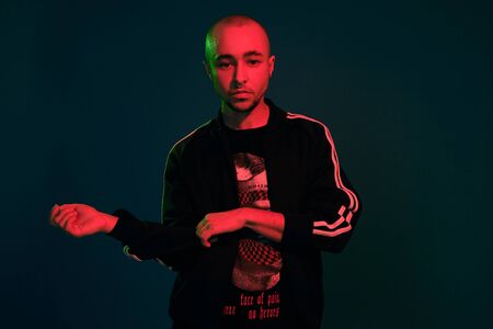 Studio shot of a young tattoed bald man posing against a colorful background. 90s style.