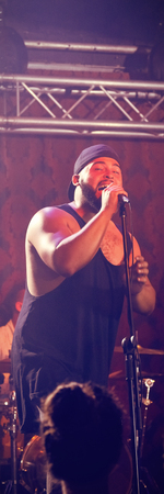 Young singer with guitarists performing on stage at nightclub