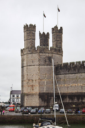 CAERNARFON, WALES - 29 SEPTEMBER 2013: Caernarfon Castle, well-known for its polygonal towers, dates from the 13th century. In 1969 Prince Charles was invested here as Prince of Wales by HM Queen Elizabeth II.