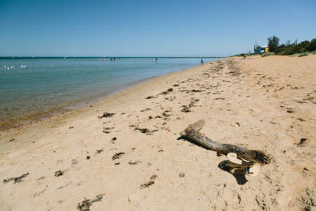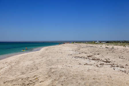 People on the beach on the Spit Belyayus in Crimea in Russia.