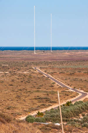 Winding road through bush land leading to tall white antennas in the back of nearby Naval base. Horizon is deep blue Indian ocean under light blue sky.