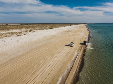 Cars drive along the sandy beach creating water sprays. Aerial view