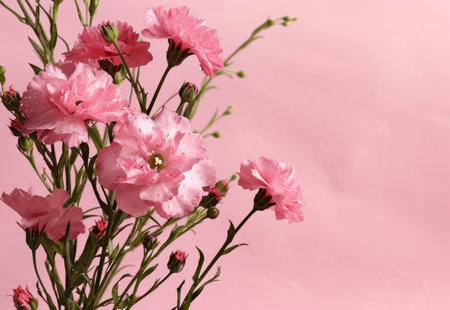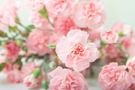 Close-up of a lovely bunch of pink carnations against a soft pink background. A gentle spring scene.