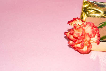 Red mini carnation and gift box. Concept of giving present at mothers day as surprise, flat lay, top view On pink Background