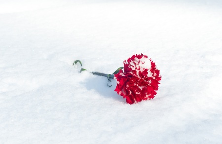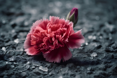 Pink carnation flower on black sand. Shallow depth of field. Toned.