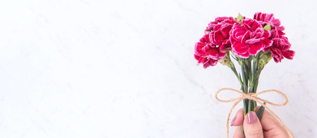 May mothers day idea concept photography - Beautiful blooming carnations tied by rope bow holding in woman's hand isolated on bright modern table, copy space, flat lay, top view